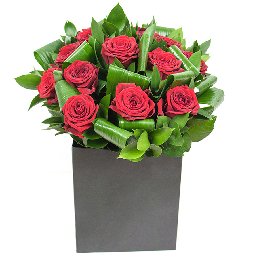 Enhance your home with our artistic red roses bouquet, a perfect blend of beauty and sophistication. This captivating arrangement features vibrant red roses accompanied by rich aspidistra leaves and elegant ruscus, meticulously designed to create a stunning visual impact.